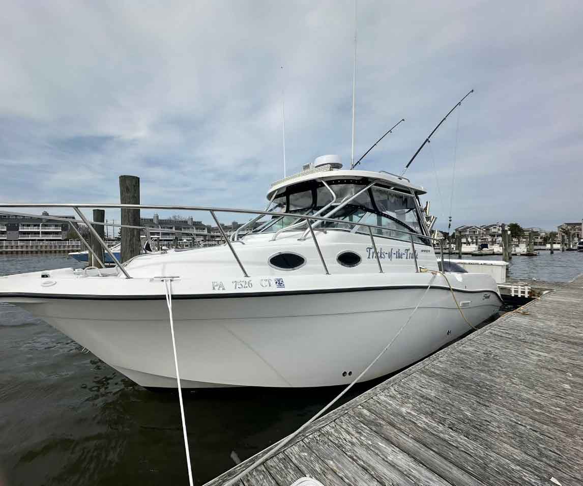 The boat is equipped with Simrad radar, outriggers, two radios, two electric deep-drop ports, two 90-degree swivel rod holders, a generator, a light bar, a life raft, a full head, and more.